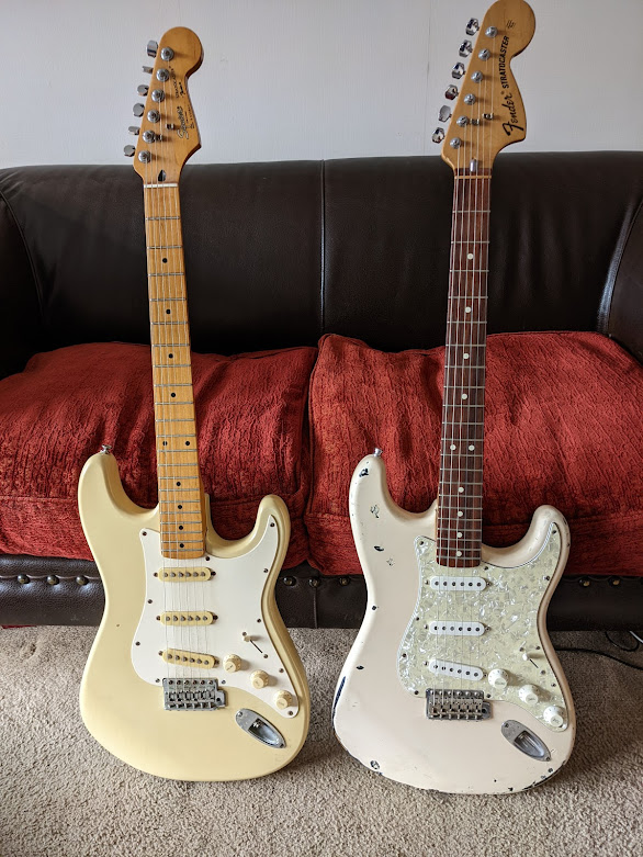 You know what they say about buses, you wait for one and two come along together. When I went to pick up the 1970’s style Fender Stratocaster on the right, I came away with a second one which is a fantastic sounding and playing 1989 Korean Fender Squier Stratocaster. I just love the large 70’s headstock on the Fender. It looks like it’s been used to hammer in fence posts, but I love the road warrior look. Nice!!!